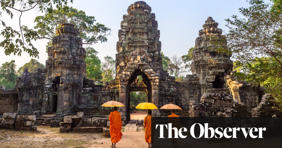 Only 28 temples can be visited, but its estimated there are about 1,000 strewn across the jungle. The city of Angkor would have been a medieval metropolis. Its scale is mind-boggling. It is thought Angkor Wat, one of the most famous religious buildings in the world, was heaved into existence by a labour force of 300,000 people and 6,000 elephants. But the Wat isnt even the largest construction that honour goes to Angkor Thom. Set over 10 sq km, its enclosed by an 8m-high wall that skirts a 100m-wide moat in a gargantuan 13km square. At its centre is the bizarre edifice of Bayon. It was the state temple of Jayavarman VII known by all the guides as J 7, which makes him sound like a boy band or an alcopop. Bayon has 54 crumbling towers embossed with 216 vast and enigmatically smiling faces. Then there is 1.2km of bas-reliefs incorporating more than 11,000 figures. With your eyes still bulging, you exit and stumble towards Ta Prohm. This is the temple, devoured by the jungle, which featured in Tomb Raider, starring Angelina Jolie.
